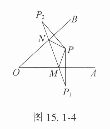 4. 如图 15.1 - 4,点 $P$ 为 $\angle AOB$ 内一点,分别作出点 $P$ 关于 $OA$,$OB$ 的对称点 $P_1$,$P_2$,连接 $P_1P_2$ 交 $OA$ 于点 $M$,交 $OB$ 于点 $N$,$P_1P_2 = 15$,则 $\triangle PMN$ 的周长为