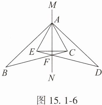6. 如图 15.1 - 6,$\triangle ABC$ 与 $\triangle ADE$ 关于直线 $MN$ 对称,$BC$ 与 $DE$ 的交点 $F$ 在直线 $MN$ 上,连接 $EC$。若 $ED = 4\ cm$,$FC = 1\ cm$,$\angle BAC = 76^{\circ}$,$\angle EAC = 58^{\circ}$。