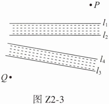 问题 3:如图 Z2 - 3,在 $ P $,$ Q $ 两村之间有两条河,且每条河的宽度相同,从 $ P $ 村到 $ Q $ 村,要经过两座桥 $ EF $,$ MN $。现在要设计一条道路,并在两条河上分别架这两座垂直于河岸的桥,问:如何设计桥 $ EF $,$ MN $ 的位置,使由 $ P $ 村到 $ Q $ 村的路径最短?(要求在图上标出道路和桥的位置)
