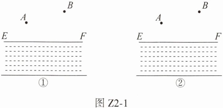 (1) 若要使自来水厂到 $ A $,$ B $ 两村的距离相等,则应选择在哪里建厂?请在图 Z2 - 1①中画出来,并用点 $ P_{1} $ 表示;