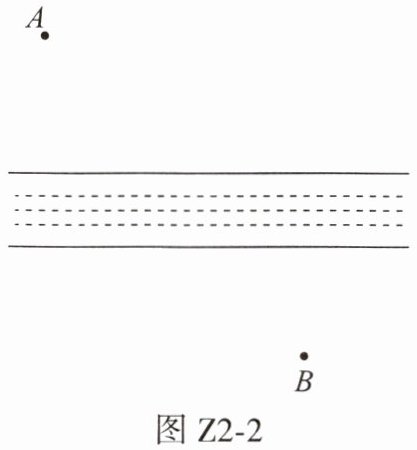 问题 2:如图 Z2 - 2,村庄 $ A $,$ B $ 在一条河的两岸,现要在河上建一座小桥,桥的方向与河垂直,设河的宽度不变,试问:桥架在何处,才能使从 $ A $ 到 $ B $ 的路径最短?