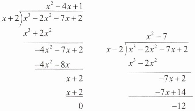 22. (6 分)小磊和小轩在课外练习中碰到了一个问题,需要对多项式 $x^{3}-2x^{2}-7x+2$ 进行因式分解. 小磊认为该整式一定有一个因式 $x + 2$,小轩认为必有因式 $x - 2$,两人找到老师寻求帮助. 老师提供了一个方法:因式分解是整式乘法的逆运算. 若整式 $A$ 能被整式 $B$ 整除,则 $B$ 必为 $A$ 的一个因式. 老师给出了演算方法: