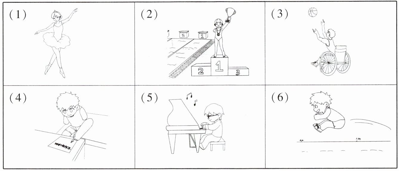 (3) 图片中男孩坐在轮椅上打篮球,结合首字母“w”,可知此处应填“well”,表示“好地”,修饰动词“plays”,说明他篮球打得很好。