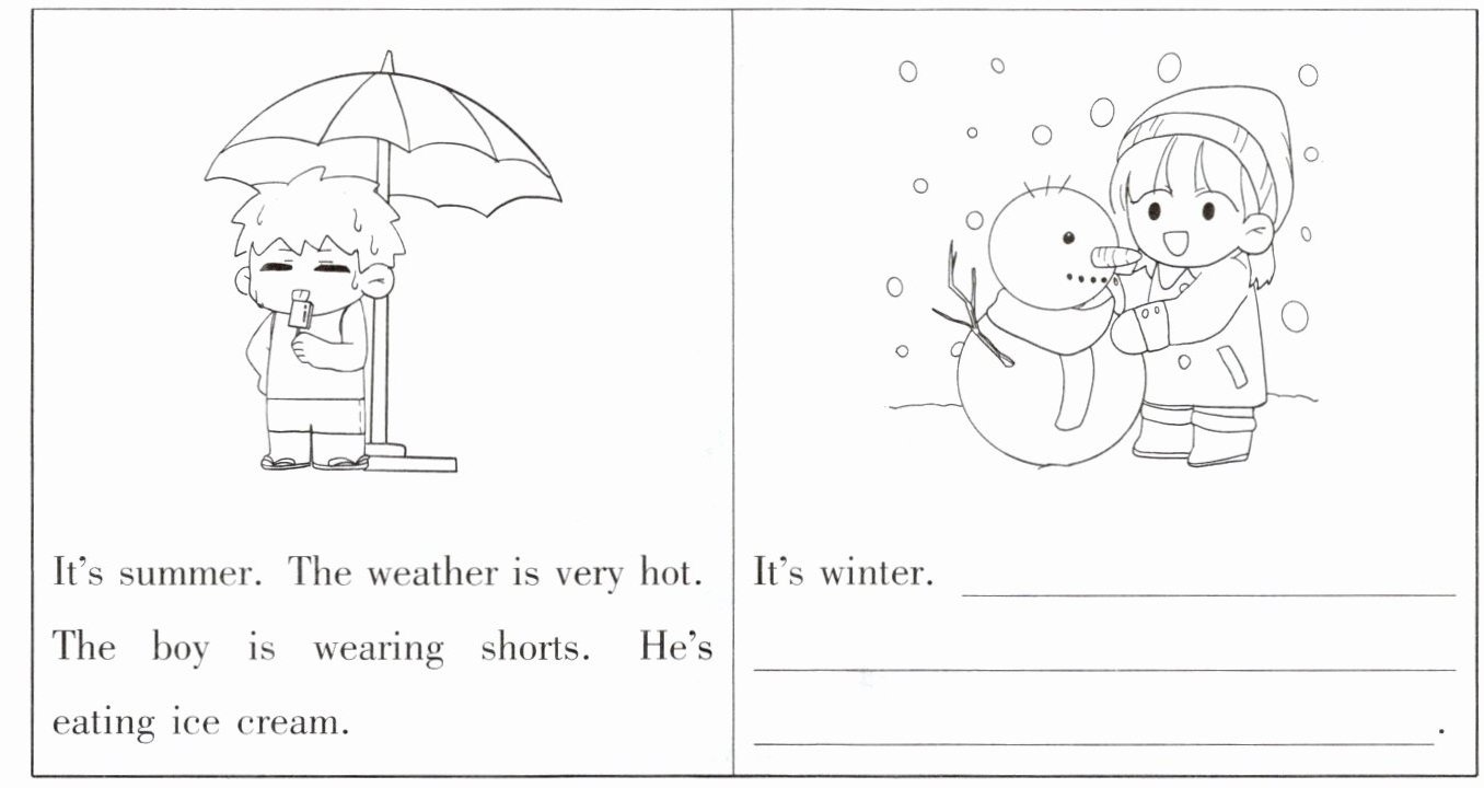 6. It's winter. The weather is very cold. The girl is wearing a coat and a hat. She's making a snowman.