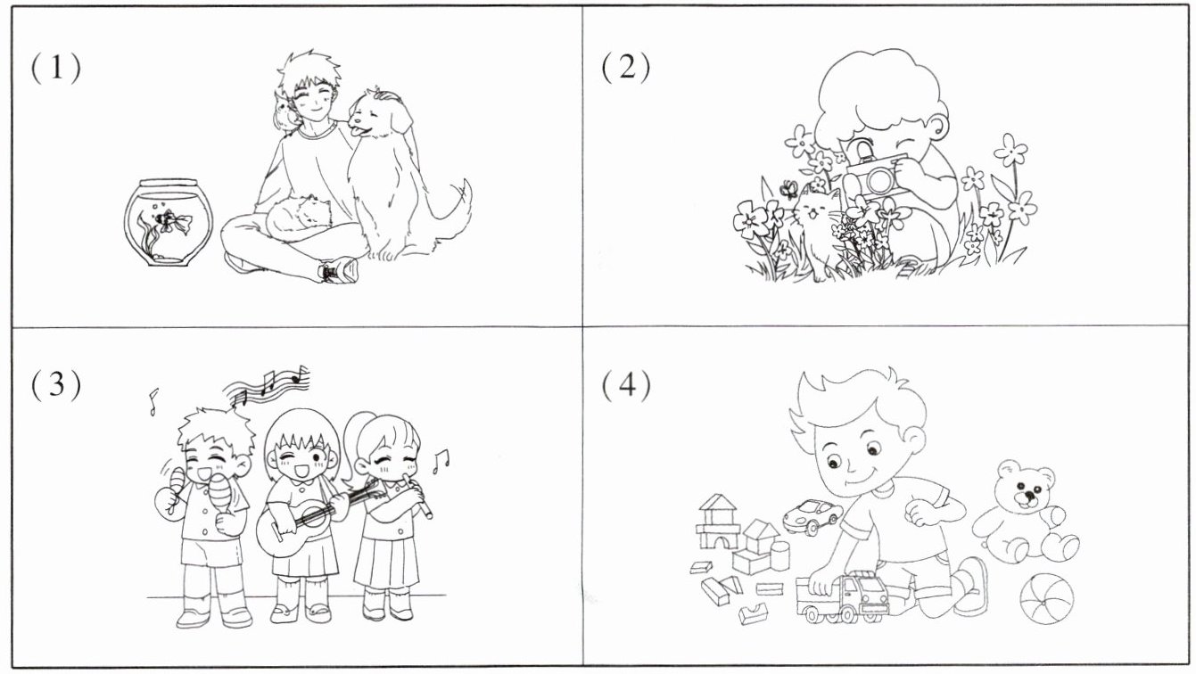 (3) 图片中三个人拿着乐器,有音乐符号,可知他们的爱好是“唱歌和玩乐器”,“唱歌”是“singing”,“玩乐器”用“playing instruments”,爱好是复数概念,所以用“singing and playing instruments”。