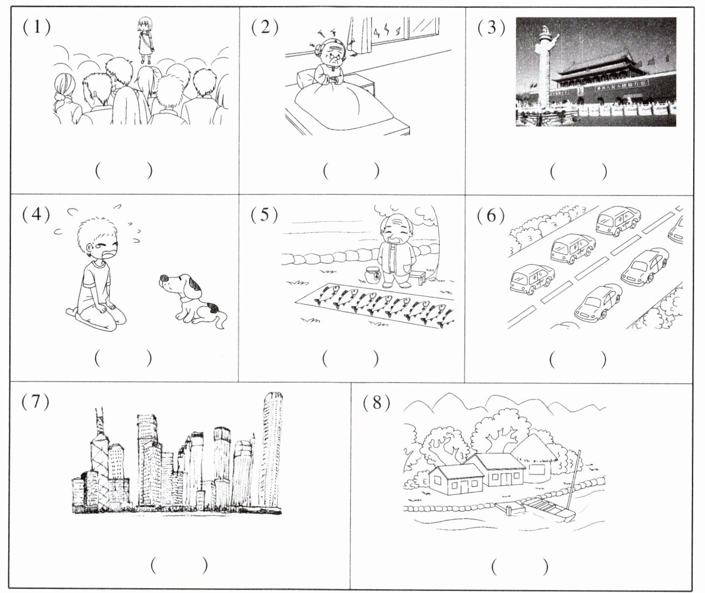 基础2. 听句子,在图片下写出相应句子的英文大写字母编号。