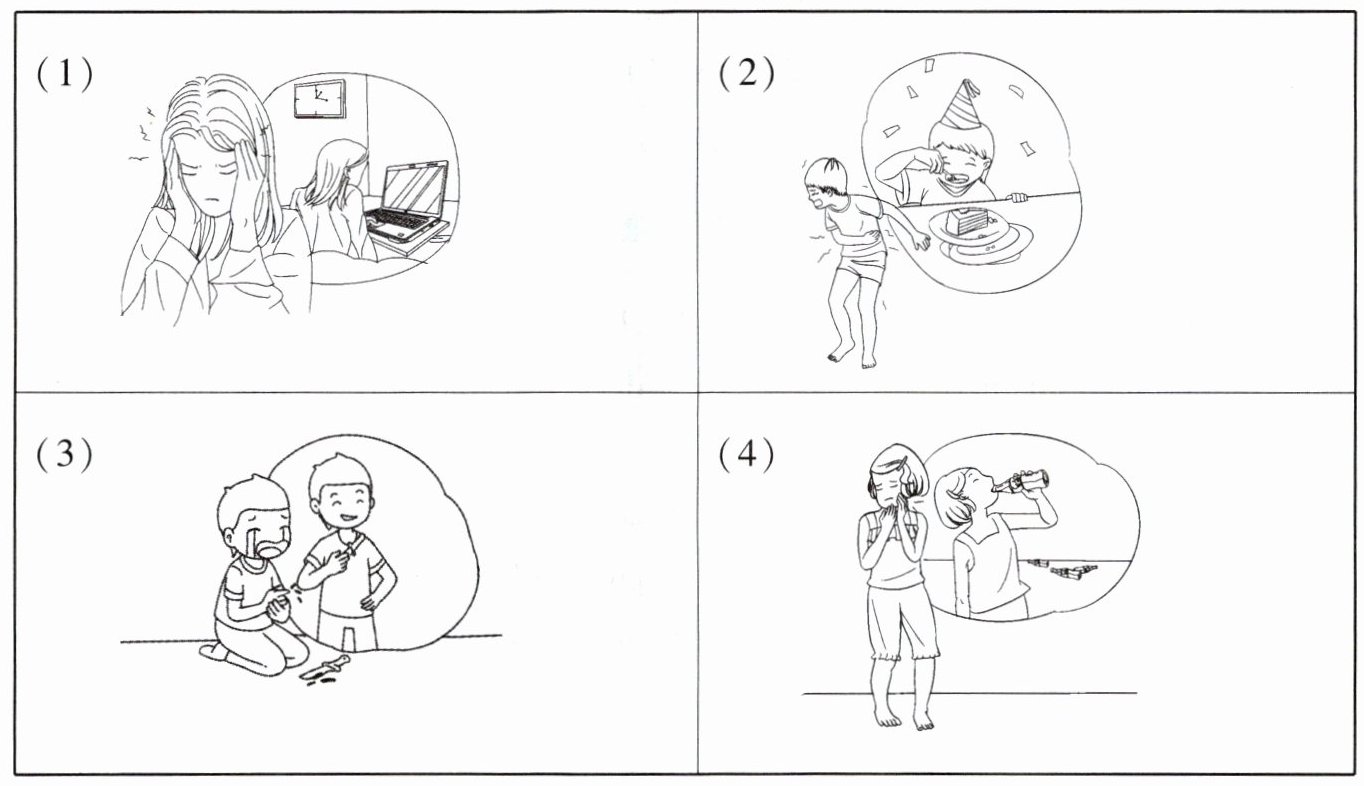 (4) has a toothache. She drank too much coke. I think she should go to the hospital/...
