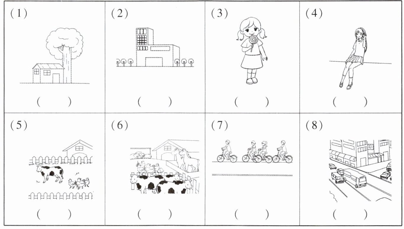 8. 看图选句子,把其英文大写字母编号写在相应图下的括号内。
