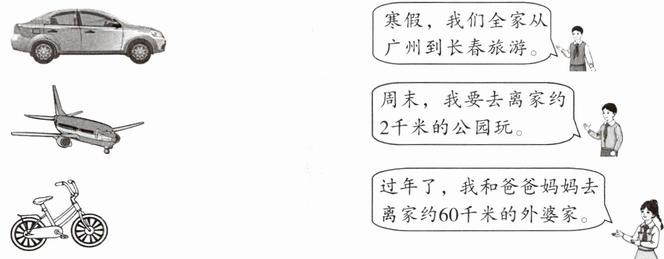 1. 连一连,出行时选择哪种交通工具比较合适?