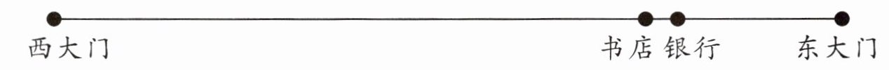 5. 下图中,爸爸骑自行车从西大门出发经过书店到达银行,共骑行了 $ 2 $ 分钟,他每分钟骑行约 $ 200 $ 米。妈妈从东大门经过银行到达书店共步行了约 $ 100 $ 米。