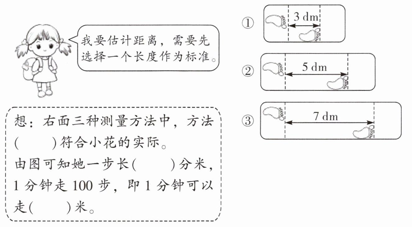 想:右面三种测量方法中,方法(②)符合小花的实际。由图可知她一步长($5$)分米,$1$分钟走$100$步,即$1$分钟可以走($50$)米。