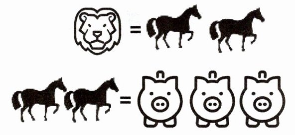 我是这样想的:3头猪的体重为100+100+100=300(千克),3头猪的体重又等于2匹马的体重,根据等量的等量相等,2匹马的体重为300千克。2匹马和一头狮子的体重相同,那么一头狮子的体重就等于300千克。