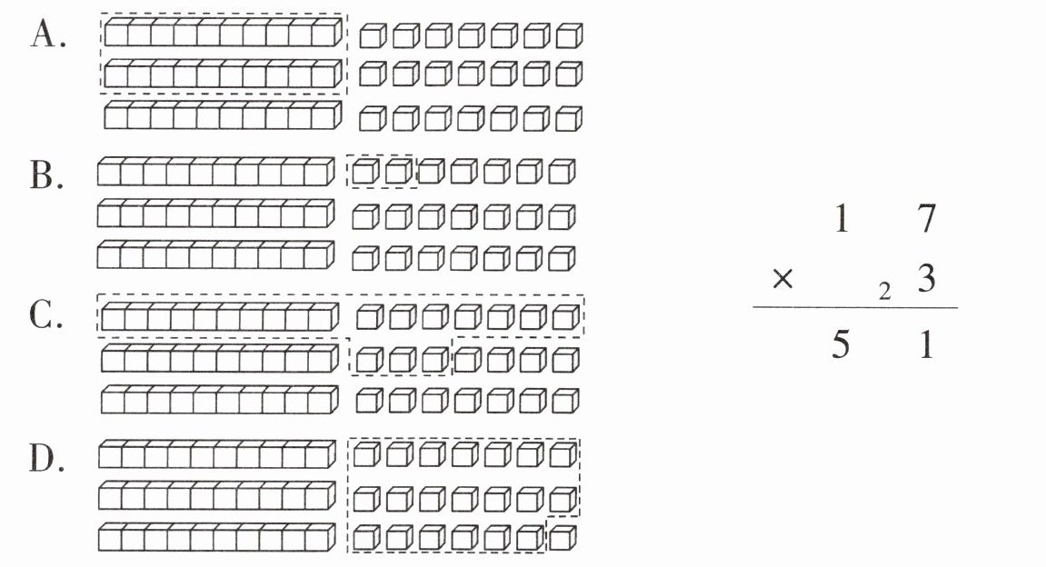 2. 下列选项中,圈起来的部分能表示下面竖式中进位的“2”的是(
