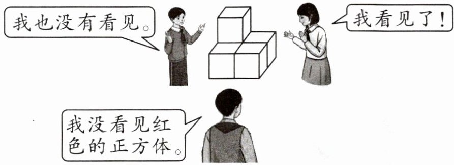 8. 三位同学用5个正方体(其中一块是红色)搭成下面的图形,你知道红色的正方体是哪一个吗?请把它涂上颜色。