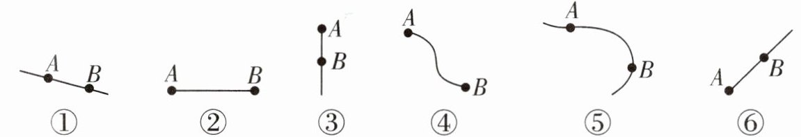 (1)(①)是直线,(③)是射线,(②)是线段;直线有(0)个端点,射线有(1)个端点,线段有(2)个端点。图①可以记作(直线$AB$或直线$BA$)图②可以记作(线段$AB$或线段$BA$)图③可以记作(射线$AB$)