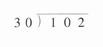 因为$1\lt30$,$10\lt30$,所以要看被除数的前三位,$102÷30$,商3,$3×30 = 90$,$102 - 90 = 12$,所以$102÷30 = 3\cdots\cdots12$,商3写在个位上。