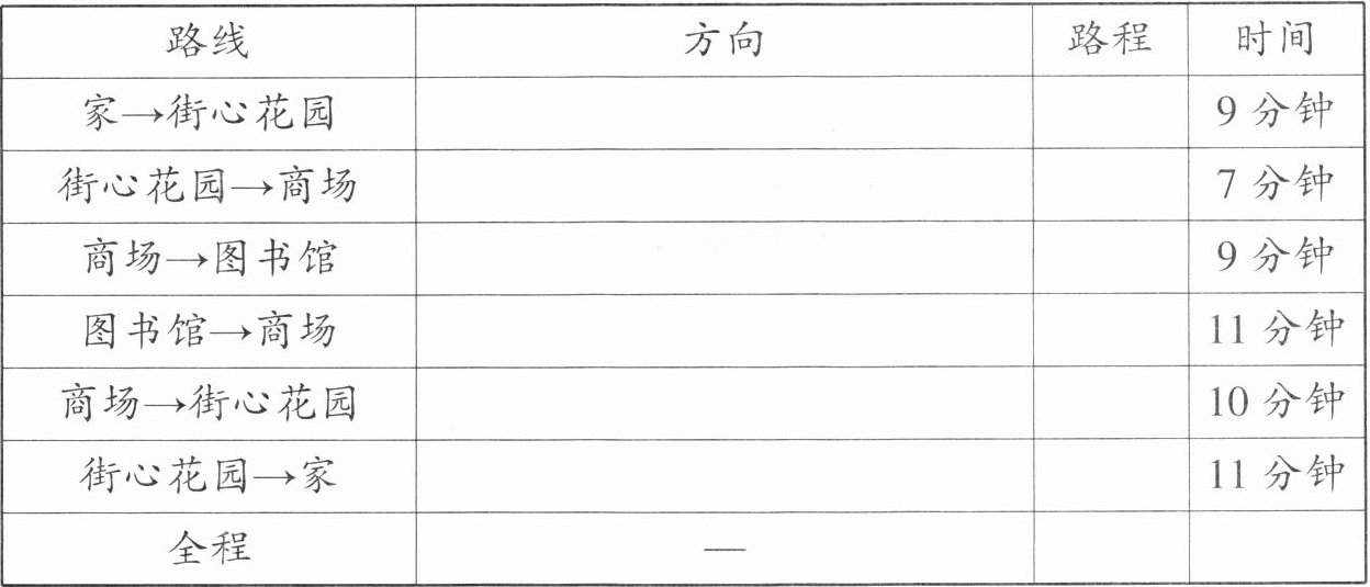 (1)根据上面的路线图,说一说玲玲从家到图书馆和回来时所走的方向与路程,并完成下表。