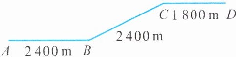 2. 如图,水平跑道AB和CD的长度分别为2400 m和1800 m,斜坡跑道BC的长度为2400 m.小明从A点出发沿跑道慢跑到达D点,小东同时从D点出发沿跑道慢跑到达A点.他们在水平跑道慢跑的速度都是100 m/min,小明在上坡跑道慢跑速度是水平跑道速度的一半,小东在下坡跑道慢跑速度是水平跑道速度的1.5倍.
