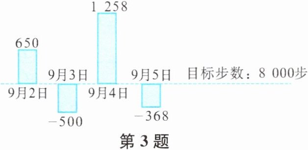 3. 如图,李叔叔在某运动APP中设定了每天的步数目标为8000步,该APP用正数表示超过目标步数的步数,用负数表示少于目标步数的步数. 则下列说法错误的是( ).