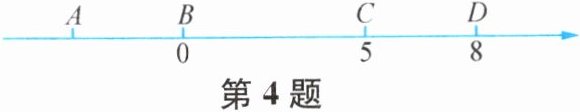 4. 小明利用计算机软件绘制了一条数轴,数轴上有A,B,C,D四点,其中点A在点B的左侧,点B在原点处,点C,D分别与5和8对应,A,B之间的距离与C,D之间的距离相等.
