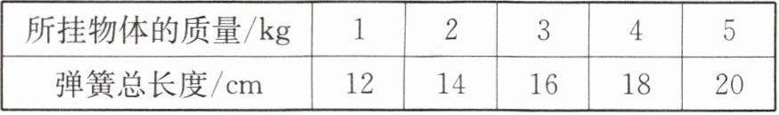(1)由表中数据可知,所挂物体质量每增加1kg,弹簧总长度增加2cm。