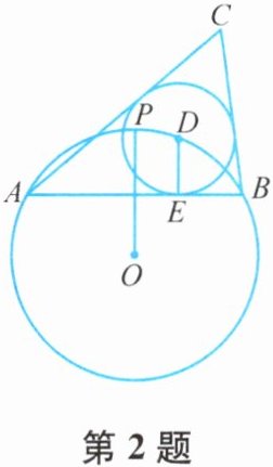 2. 如图,$\odot O$的半径为1,点$P是\odot O$上一点,弦$AB垂直平分线段OP$,点$D是\overset{\frown}{APB}$上任一点(与端点$A$,$B$不重合),$DE\perp AB于点E$,以点$D$为圆心、$DE长为半径作\odot D$,分别过点$A$,$B作\odot D$的切线,两条切线相交于点$C$.