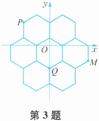 3. 如图,7个全等的正六边形不重叠且无缝隙,P,Q,M均为其顶点,若点P,Q的坐标分别为$(-2\sqrt{3},3)$,$(0,-3)$,则M的坐标为