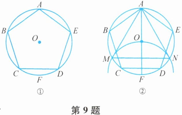 9. 如图①,正五边形ABCDE内接于$\odot O$,阅读以下作图过程,并回答下列问题:
