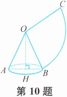 10. 如图,扇形OBC是圆锥的侧面展开图,圆锥的母线OB= l,底面圆的半径HB= r.