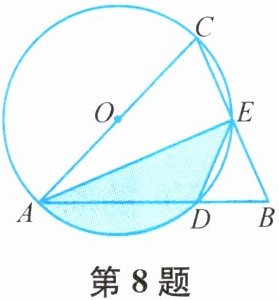 8. 如图,在△ABC中,AB= AC,以AC为直径的⊙O与AB,BC分别交于点D,E,连接AE,DE,若AB= 3,∠BED= 45°,则阴影部分的面积为______.