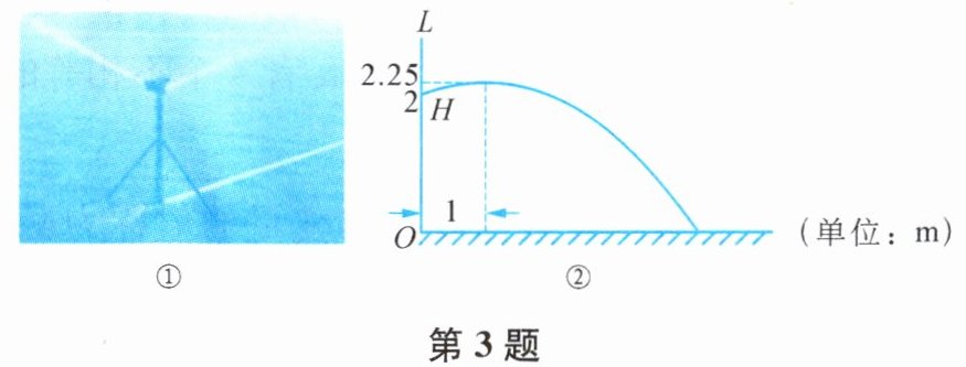 3. 如图①为喷灌系统,工作时,其侧面示意图如图②所示. 升降杆$OL$垂直于地面,喷射的水柱呈抛物线型,喷头$H$能在升降杆上调整高度,将喷头调整至离地面2 m高时,喷射的水柱在距升降杆1 m处达到最高,高度为2.25 m,此时喷射的水柱落地点与$O$的距离为