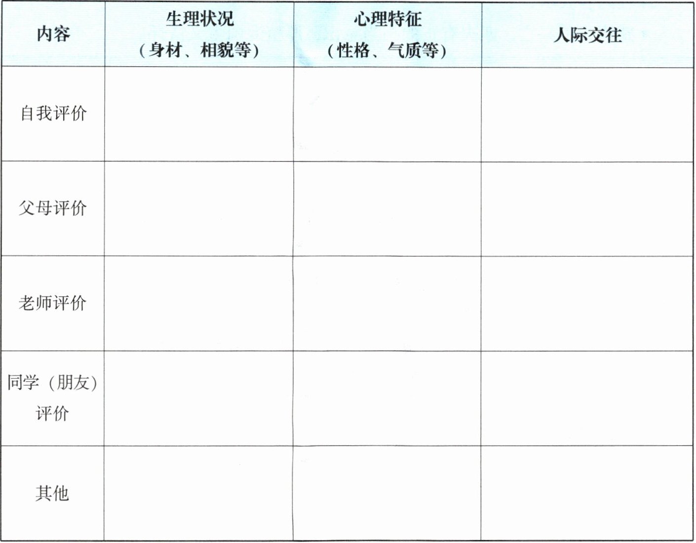 【解析】:本题主要考查正确认识自我的相关知识,通过采访不同对象来对比自我评价与他人评价,从而更全面地认识自己。需要填写表格中不同对象对生理状况、心理特征、人际交往方面的评价,然后总结自我评价与他人评价的结果,选择最认同的评价并表达感受,同时明确采访形式和收获。