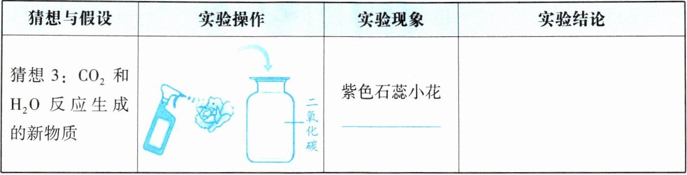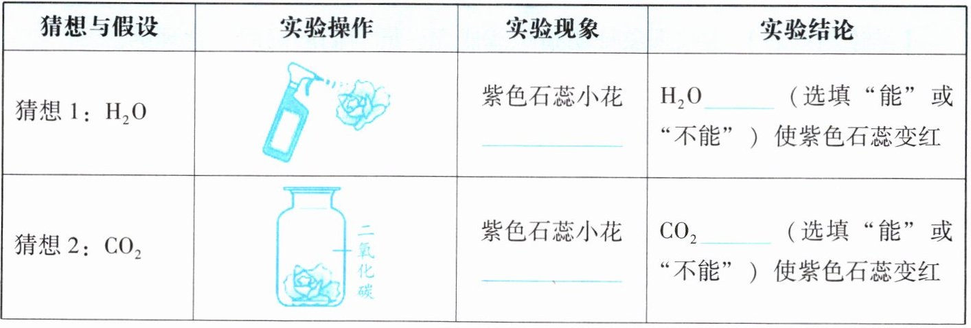 |猜想1:$H_2O$||紫色石蕊小花______|$H_2O______($选填“能”或“不能”)使紫色石蕊变红|