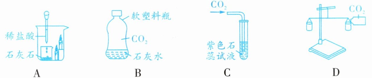 A选项:通过石灰石与稀盐酸反应产生二氧化碳,此实验主要体现的是化学反应生成二氧化碳的过程,不仅展示了$CO_2$的物理性质(如密度比空气大,用向上排空气法收集),更重要的是展示了其化学性质(与石灰水反应生成沉淀),所以A选项不符合题意。