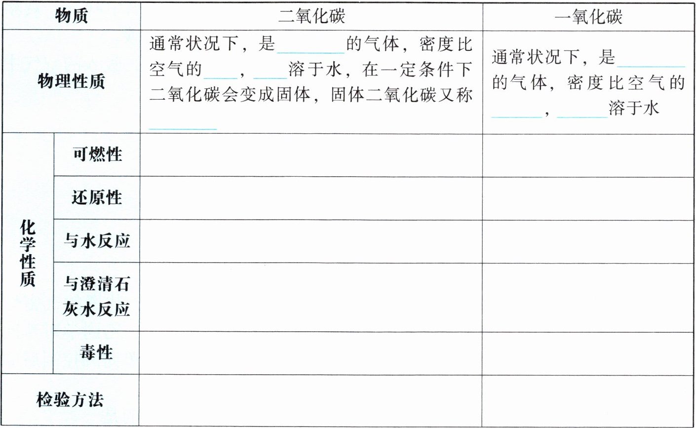 物理性质:根据所学知识可知,通常状况下二氧化碳是无色无味的气体,密度比空气大,能溶于水,固体二氧化碳又称干冰;一氧化碳通常状况下是无色无味的气体,密度比空气略小,难溶于水。
