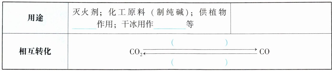 | 相互转化 | $CO_2 \underset{( )}{\stackrel{( )}{\rightleftharpoons}} CO$ | |