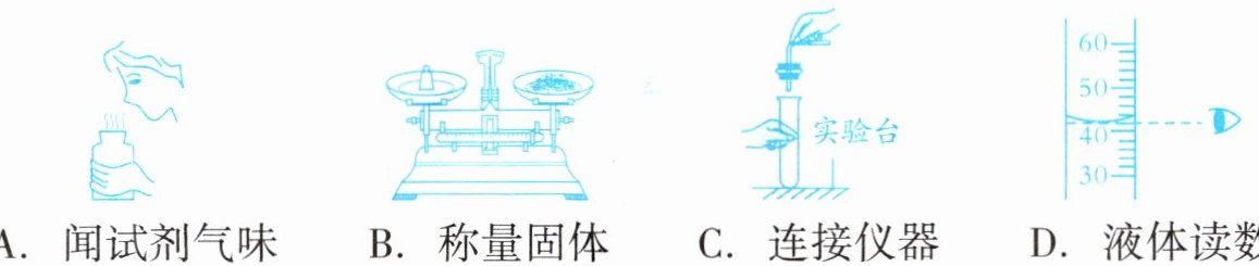 解:A选项,闻试剂气味时,应用手在瓶口轻轻扇动,使少量气体飘进鼻孔,图中直接将鼻子凑近瓶口,操作错误。