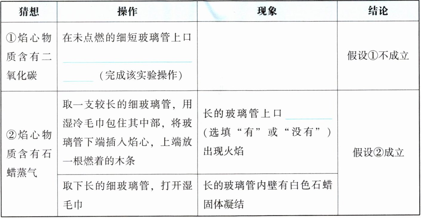 | ①焰心物质含有二氧化碳 | 在未点燃的细短玻璃管上口______(完成该实验操作) | ______ | 假设①不成立 |