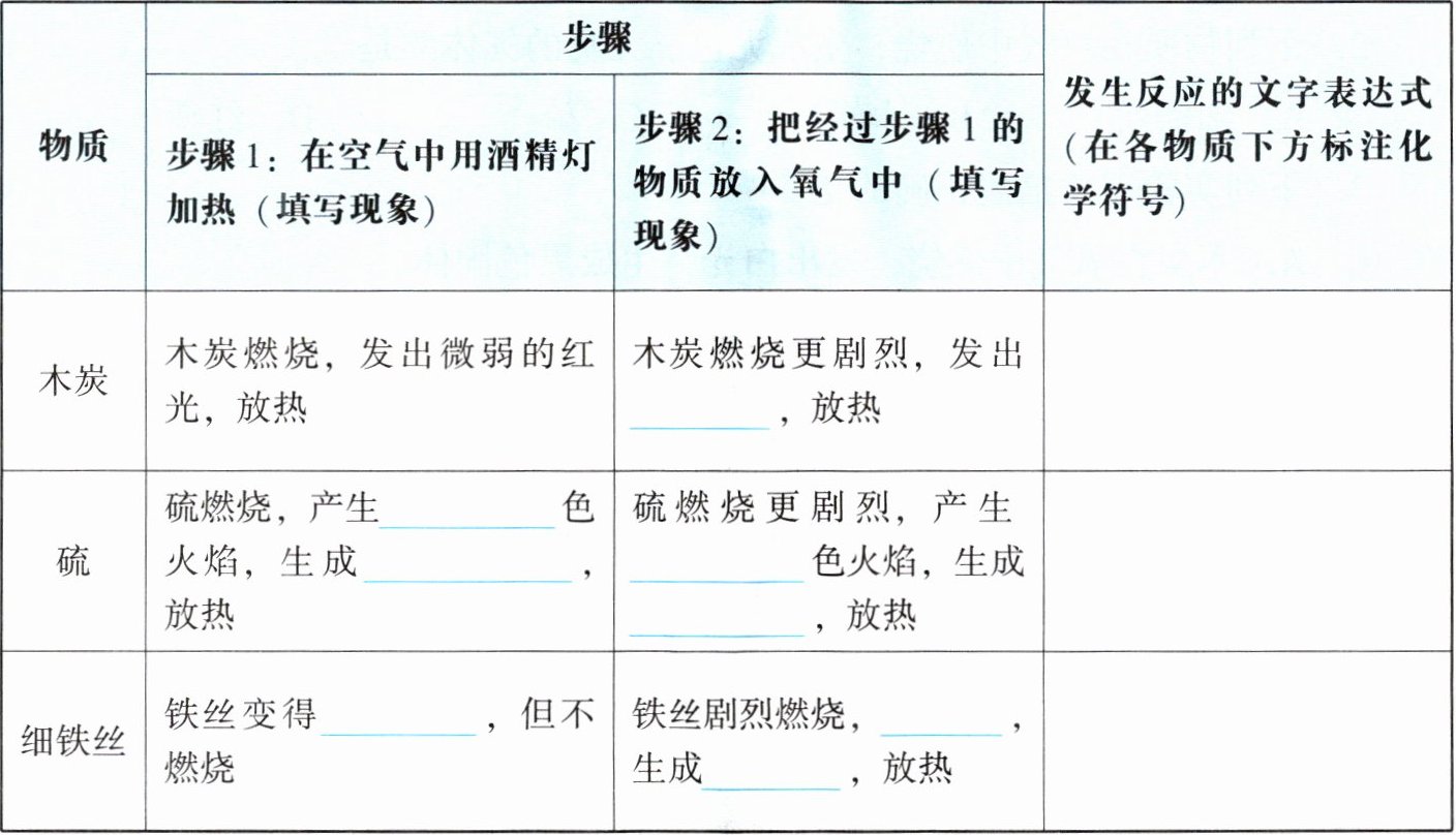 | 物质 | 步骤 1:在空气中用酒精灯加热(填写现象) | 步骤 2:把经过步骤 1 的物质放入氧气中(填写现象) | 发生反应的文字表达式(在各物质下方标注化学符号) |