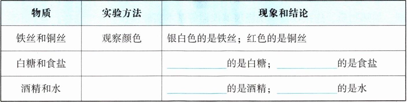 | 白糖和食盐 | 品尝味道 | 有甜味的是白糖;有咸味的是食盐 |