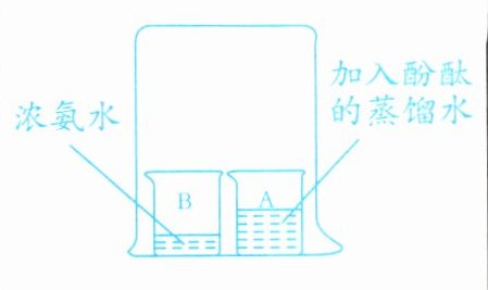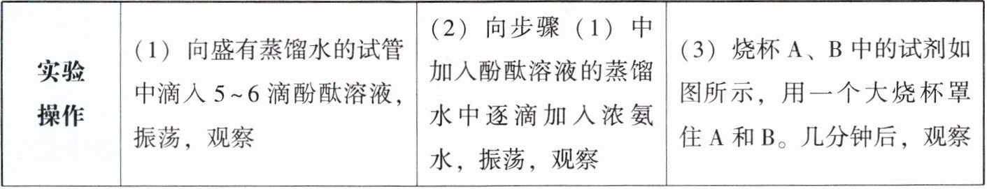 | 实验操作 | (1)向盛有蒸馏水的试管中滴入5~6滴酚酞溶液,振荡,观察 | (2)向步骤(1)中加入酚酞溶液的蒸馏水中逐滴加入浓氨水,振荡,观察 | (3)烧杯A、B中的试剂如图所示,用一个大烧杯罩住A和B。几分钟后,观察 |