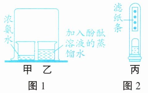 5. 某同学对教材中探究分子性质的实验(见图1)进行了改进,如图2所示,试管丙中有一张每隔1厘米滴有一滴酚酞溶液的滤纸条,装有适量浓氨水的敞口小药瓶固定在橡皮塞上。关于图1、图2中的实验有以下说法,其中错误的是( )