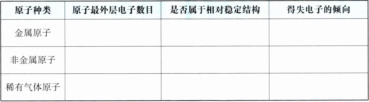 |原子种类|原子最外层电子数目|是否属于相对稳定结构|得失电子的倾向|