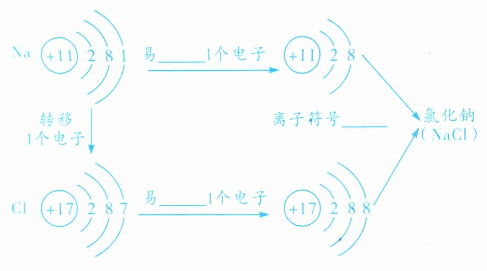 以钠与氯气的反应为例,当燃着的钠和氯气相遇时,氯气的分子($Cl_2$)分开成单个的氯原子($Cl$),与钠原子($Na$)发生了如下变化: