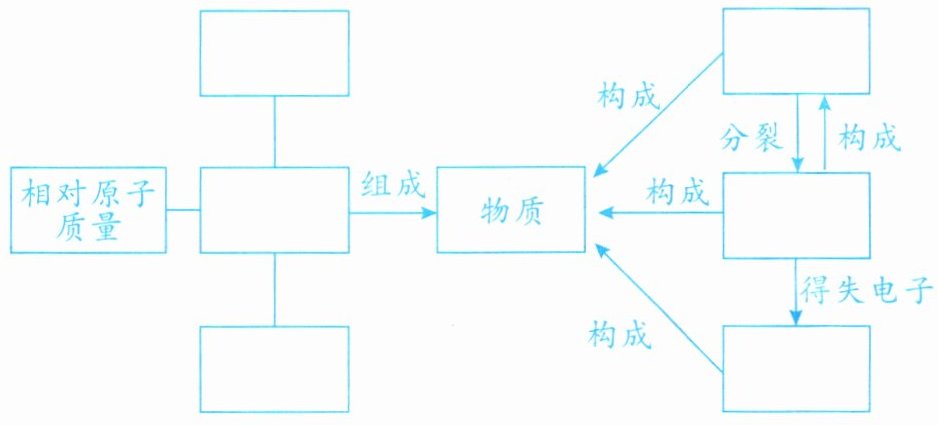 $\boxed{}$ $\xrightarrow{相对原子质量}$ $\boxed{}$ $\xrightarrow{组成}$ 物质 $\xrightarrow{构成}$ $\boxed{}$ 例如:${H_2O}$、______、______等; $\xrightarrow{构成}$ $\boxed{}$ 例如:${Ne}$、______、______等; $\xrightarrow{构成}$ $\boxed{}$ $\xrightarrow{得失电子}$ $\boxed{}$ 例如:${NaCl}$、______、______等。