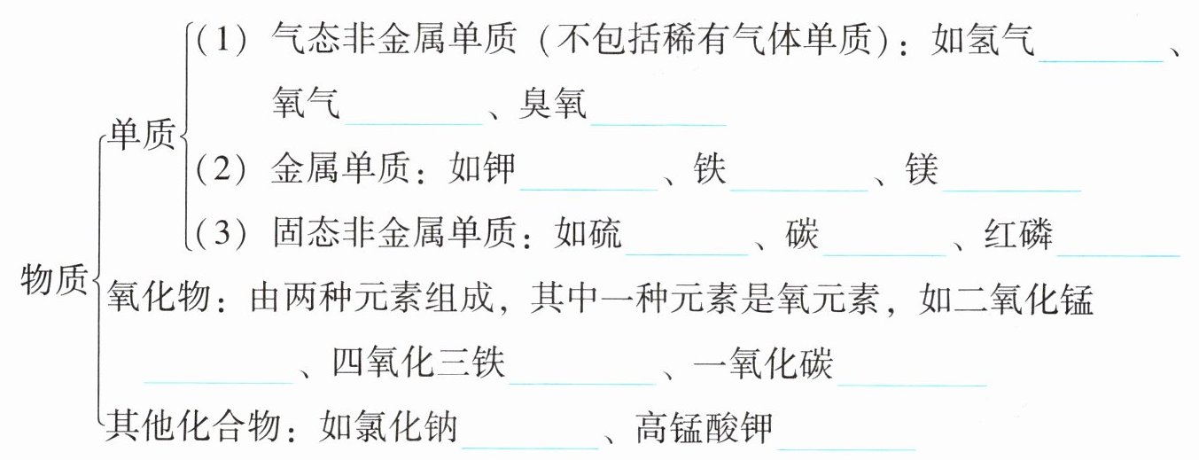 物质$\begin{cases}单质\begin{cases}(1) 气态非金属单质(不包括稀有气体单质):如氢气______、氧气______、臭氧______ \\(2) 金属单质:如钾______、铁______、镁______ \\(3) 固态非金属单质:如硫______、碳______、红磷______\end{cases} \\氧化物:由两种元素组成,其中一种元素是氧元素,如二氧化锰______、四氧化三铁______、一氧化碳______ \\其他化合物:如氯化钠______、高锰酸钾______\end{cases}$