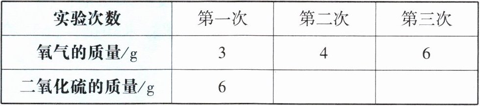(3)第三次实验中,氧气质量为6g,而硫粉只有4g,硫粉不足,应以硫粉的质量来计算生成二氧化硫的质量。4g硫粉完全反应生成二氧化硫的质量为8g(根据质量比$1:1:2$)。
