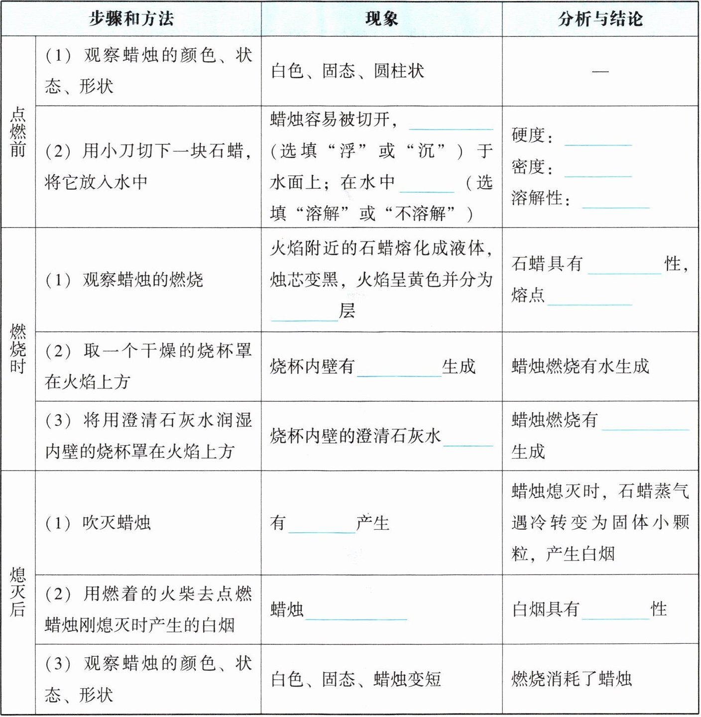 | (1)观察蜡烛的颜色、状态、形状 | 白色、固态、圆柱状 | — |