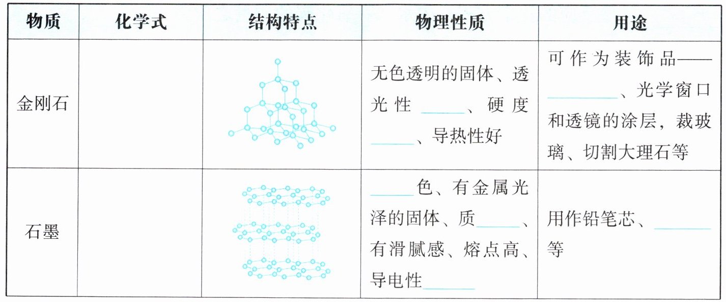 | 石墨 | C | 层状结构 | 深灰色、有金属光泽的固体、质软、有滑腻感、熔点高、导电性好 | 用作铅笔芯、电极等 |