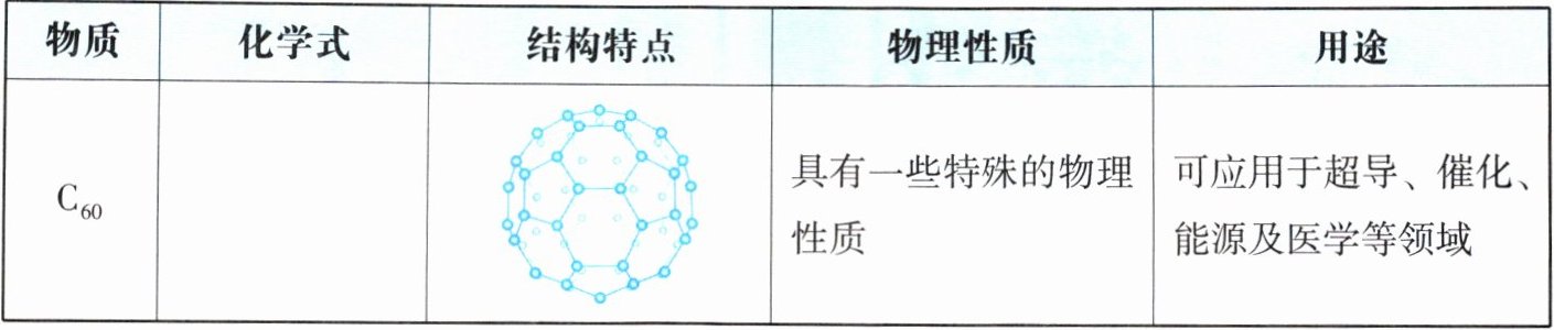 | C₆₀ | C₆₀ | 足球状结构 | 具有一些特殊的物理性质 | 可应用于超导、催化、能源及医学等领域 |